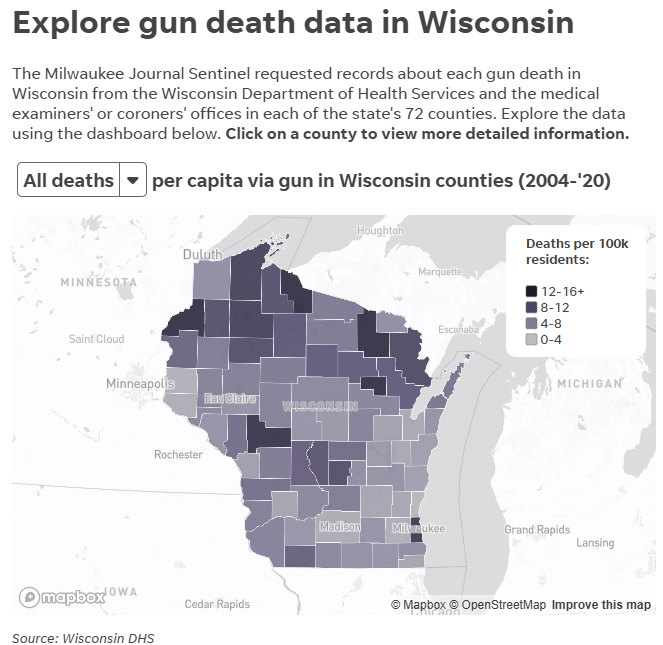 No state agency in Wisconsin maintains comprehensive records on gun deaths in the state. The Investigations Team at the Milwaukee Journal Sentinel combined the results of open records requests from all 72 counties to take the first look at gun death trends across the state. This dashboard is part of the Milwaukee Journal Sentinel’s award-winning Behind the Gun series.