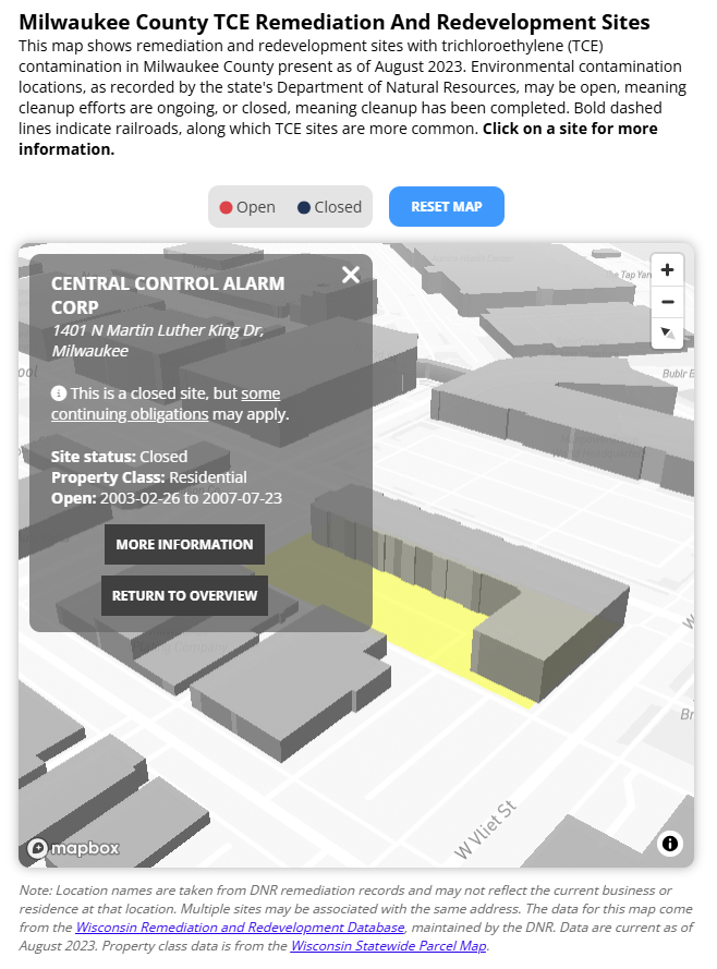 In 2023, several Milwaukee-area residential buildings were evacuated due to unsafe levels of an industrial carcinogen, the presence of which was not disclosed to residents. I developed a map application for the Milwaukee Journal Sentinel that allows readers to view risks to their own buildings as part of a public service approach to a rapidly developing story.