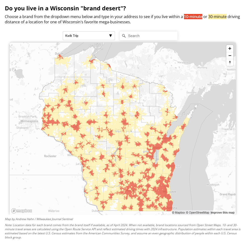 To test new technologies for the newsroom, I had the opportunity to try out approaches for more lighthearted stories. Here, I identified populations living within 10 and 30 minutes of Wisconsin’s most iconic brands. This story was part of the Wisconsin Wonk project, a content initiative focused on building trust and engagement between communities and the Milwaukee Journal Sentinel.