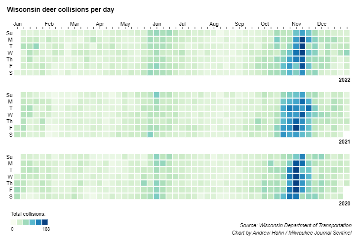 As newsroom developer at the Milwaukee Journal Sentinel, I maintained the most complete database of deer accidents in the state from data acquired through an annual open records request from the Department of Transportation.