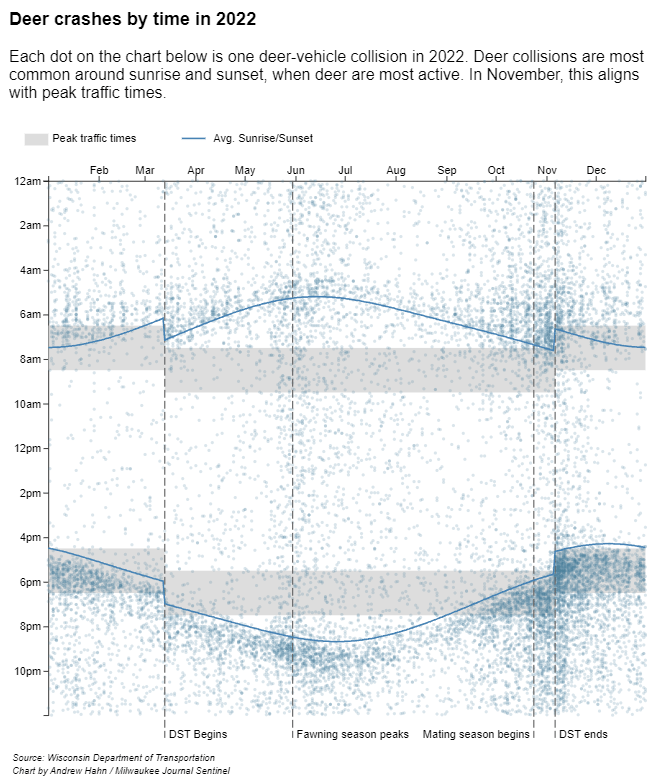 The end of Daylight Saving Time corresponds with “the rut” in Wisconsin, the mating season that is the most active period for white-tailed deer. Rolling back the clocks by an hour near the beginning of November brings rush hour into the most active time of day for the animals as well.